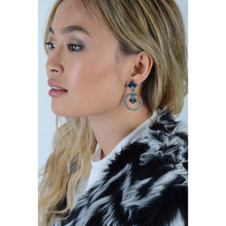 ₨ 1500These shimmering, tempting and so opulent dangling earrings have our heart with its sassy hints and sumptuous cuts that promise to instantly make us twinkle like the stars. This gorgeous statement earrings tick all fashion boxes for those wanting to look ultra-glamorous and bravura from within with its vivacious geometric design details further amped with glittering blue diamantes and luscious silver tinges. Featuring a vivacious metallic silver hoop cut and a fabulous sheen for you to feel like a true princess, we just can’t get over the sheer prettiness of these geometric earrings with its dazzling silver studded hints and outstanding metallic silver tinges for your desirable feminine vibes to shine like a diamond and fill you with compliments every time. Team these alluring dangling earrings with a patterned blue flared midi dress for a luxurious night-out that shines. -