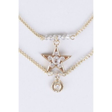 ₨ 1500Are you looking for something that would look like an absolute killer with your low cleavage party wear that you so want to wear to the upcoming event? Here is an absolute no-failure choice of jewellery that would team remarkably well with that sexy dress of yours. A captivatingly beautiful double-layered necklace that is comprised of two layered gold link chains, rhinestones, a star pendant on one chain and a small sphere-like charm on the other, and clasp closure. An enchantingly beautiful piece of jewel that is best suited for the classiest affairs. Inspired by the taste of the royals, this splendid necklace would pair awesomely well with your finest evening gowns or sensuous body contour dresses. So put this stunner on and head out with the confidence that outshines all. -